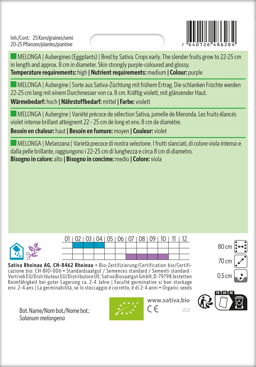 Sorte aus Sativa-Züchtung mit frühem Ertrag. Die schlanken Früchte werden 22-25 cm lang mit einem Durchmesser von ca. 8 cm. Kräftig violett, mit glänzender Haut.
