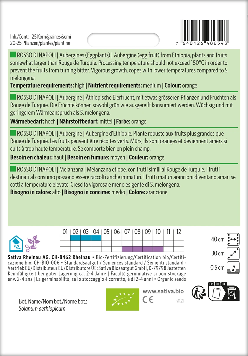 Äthiopische Eierfrucht, mit etwas größeren Pflanzen und Früchten als Rouge de Turquie. Die Früchte können für den Verzehr grün geerntet werden. Die Früchte können sowohl grün wie ausgereift konsumiert werden. Wüchsig und mit geringerem Wärmeanspruch als S. melongena