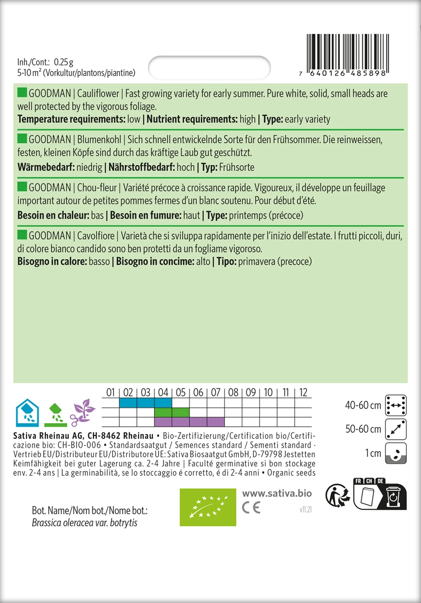 Sich schnell entwickelnde Sorte für den Frühsommer. Die reinweißen, festen, kleinen Köpfe sind durch das kräftige Laub gut geschützt.