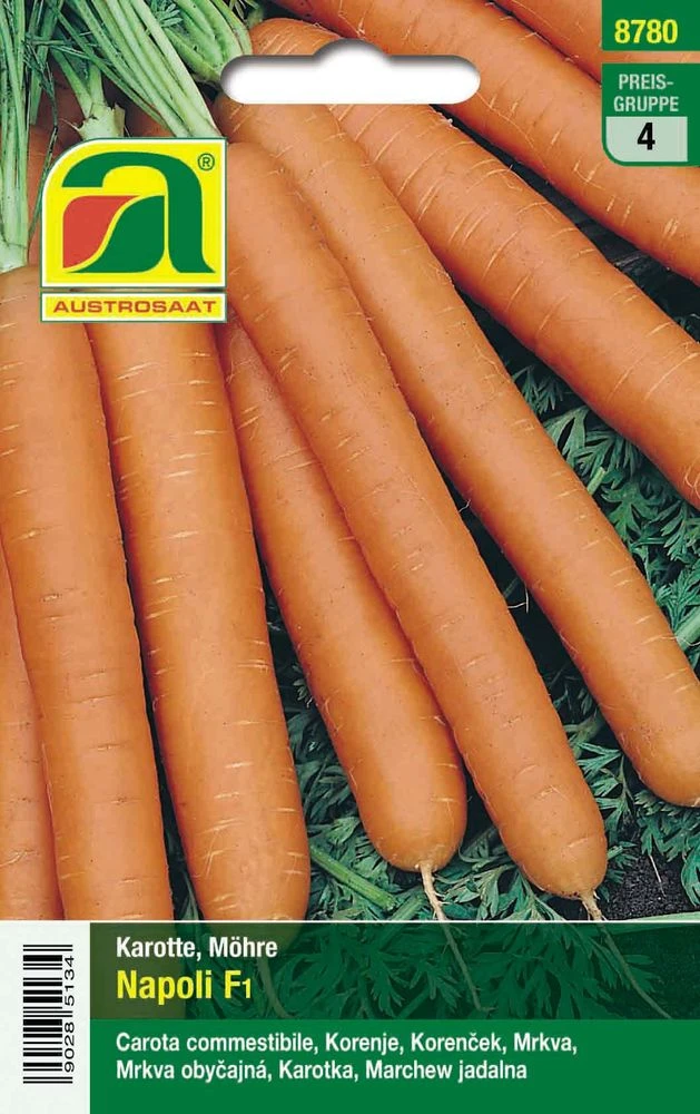 Die Austrosaat Karotte Napoli F1 (Daucus carota L.) ist eine sehr frühreifende, robuste, lagerfähige Sorte mit glatten, schön durchgefärbten Karotten. Sie ist auch für die Treib- und Vlieskultur geeignet. Eine Aussaat ist bis Mitte Juli möglich. Karotten benötigen tiefgelockerten Boden und gleichmäßige Waserversorgung.