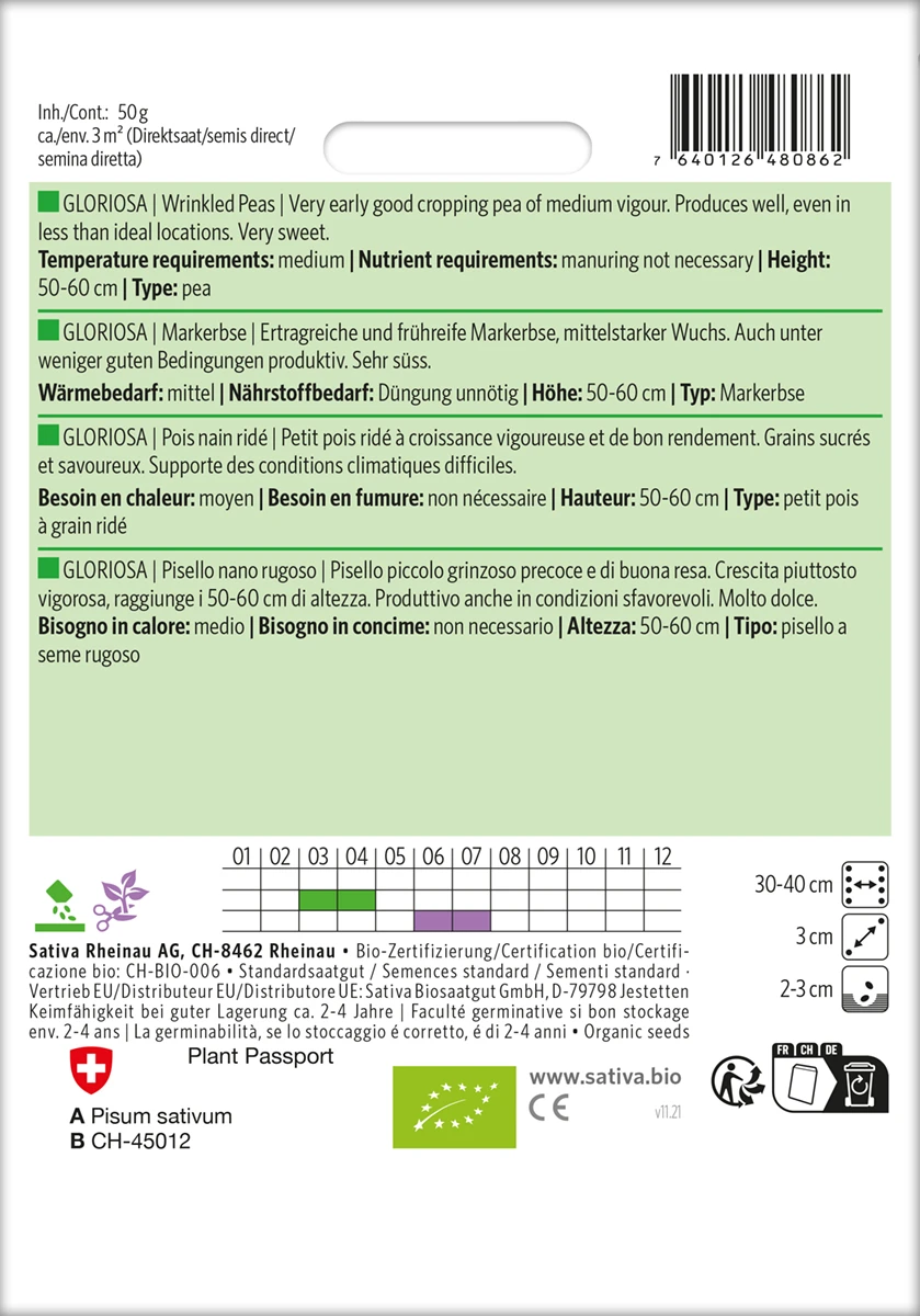 Ertragreiche und frühreife Markerbse, mittelstarker Wuchs. Auch unter weniger guten Bedingungen produktiv. Sehr süß.