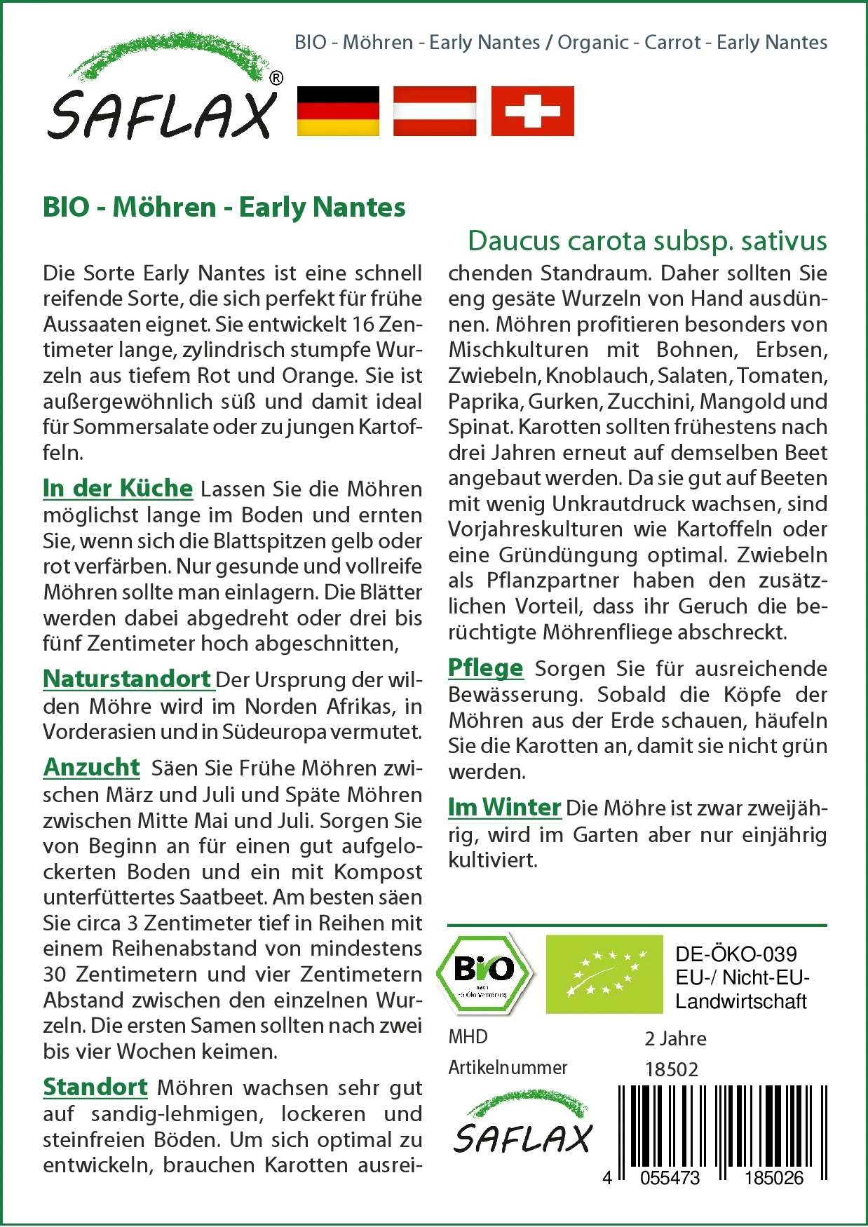 Die Sorte Early Nantes ist eine schnell reifende Sorte, die sich perfekt für frühe Aussaaten eignet. Sie entwickelt 16 Zentimeter lange, zylindrisch stumpfe Wurzeln aus tiefem Rot und Orange. Sie ist außergewöhnlich süß und damit ideal für Sommersalate oder zu jungen Kartoffeln.